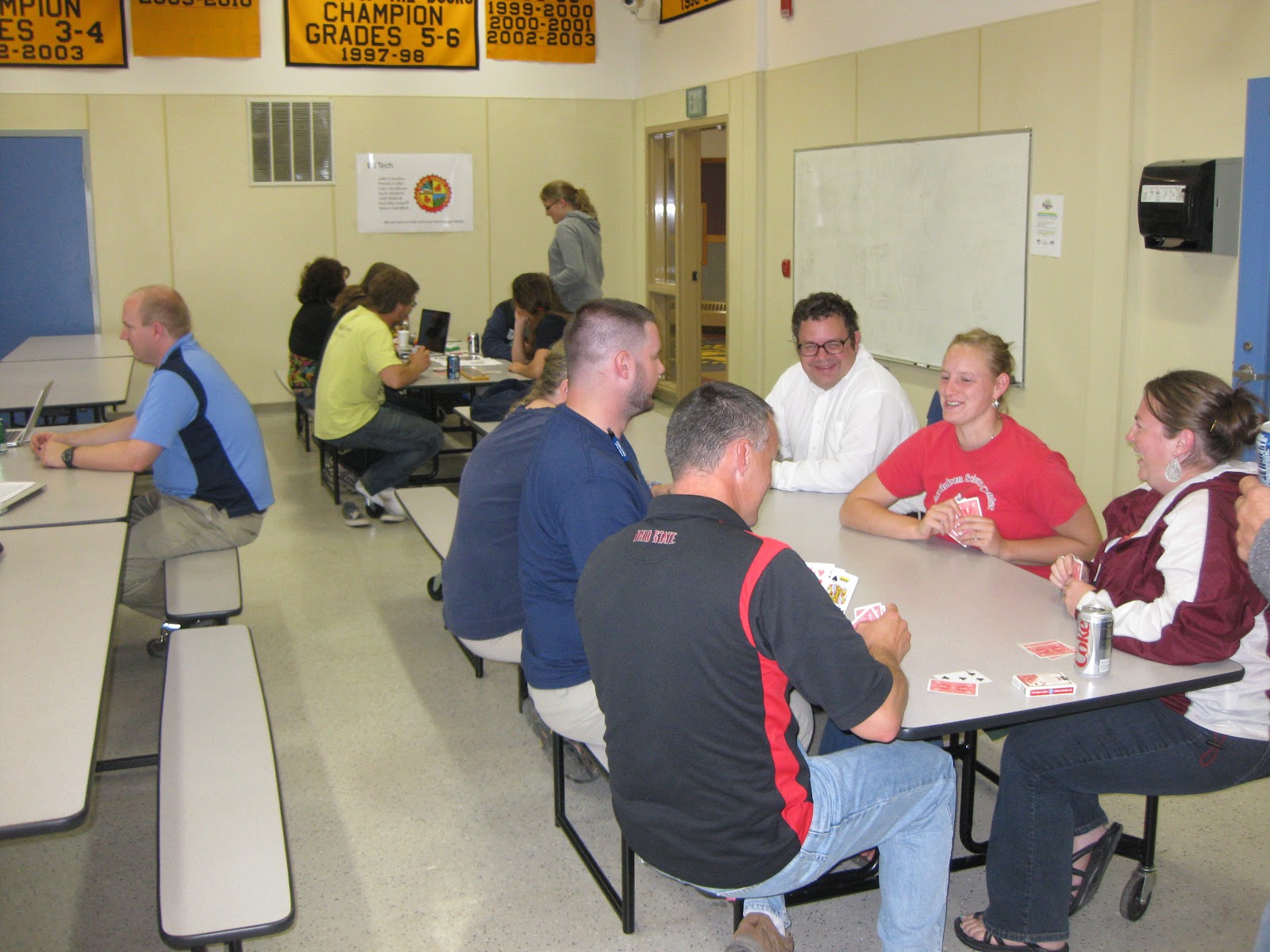 We teachers are all trapped together in our dorm.  We end up hanging out and figuring out which one of us is the best card player.  We end up playing for hours until we are too tired to continue.  We can't get sick of each other yet because it too early in the year.  Never know who you will need as a friend when your water pipes have frozen.