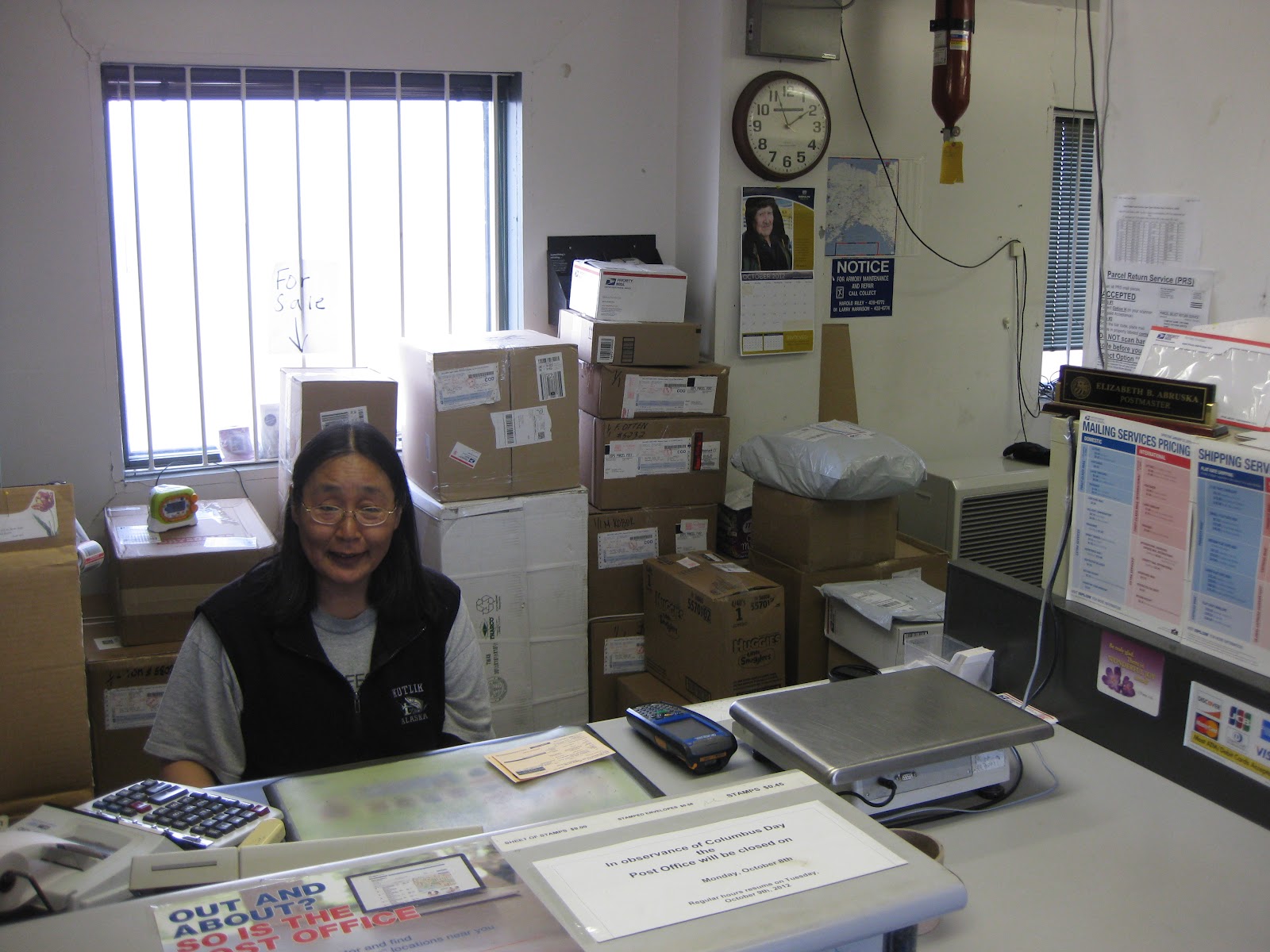 Really Postmistress Liz is a very nice lady and is very patient in dealing with a desperate new teacher who needs his box of socks that has not arrived yet.