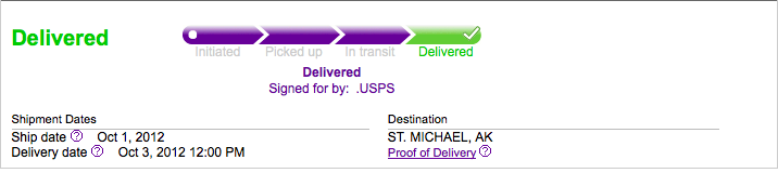 I checked today 10/6 and they have not been delivered, just like everyday since the 3rd.  What happens is that FedEx and UPS do not ship it out here.  The U.S. Postal Service does.  Once FedEx reaches the end of their commitment and hands the package over to USPS they call it good and delivered.  So my boots are someplace between Anchorage, Nome, or Unalakleet.  The record so far for something I have ordered is 5 days, that is with 2 day shipping to get it to Anchorage.  It was my balaclava, which was small so that might have given it an advantage.